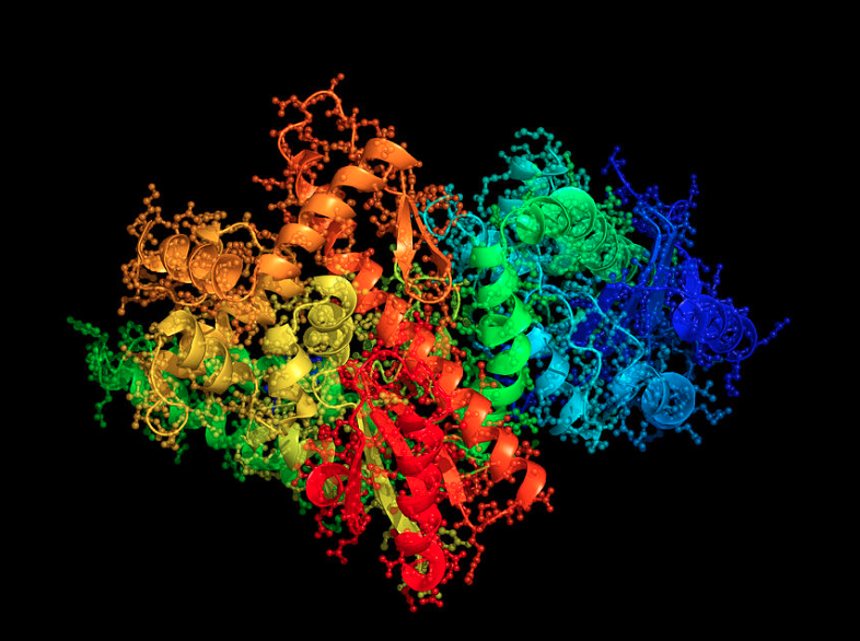 Did you know that proteins are art? One of the tools that researchers use to visualize the shape of proteins is X-ray protein crystallography. By analyzing the way that proteins scatter high-powered X-rays, scientists can look into the world of the unseen. Scientists study the shapes that are revealed in these X-ray crystal structures to understand how shape affects the function of these amazing molecules. Different sequences of the twenty natural amino acids (the primary structure) hook up to create unique and beautiful 3-D shapes (the tertiary structure). The “like” amino acids group closer together to form hydrogen bonds and the “unlike” amino acids repel each other in a symphony of interactions that ultimately creates a masterpiece. These amazing 3-D proteins then interact with other proteins and biomolecules in extremely complex reaction cascades that ultimately lead to the essential processes of life. The picture above is an X-ray structure of one such protein called RNA polymerase. This protein contains more than 30,000 atoms and it translates the genetic information in DNA to form another biomolecule called RNA.
